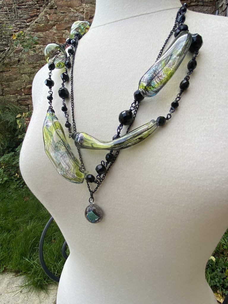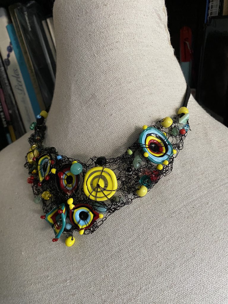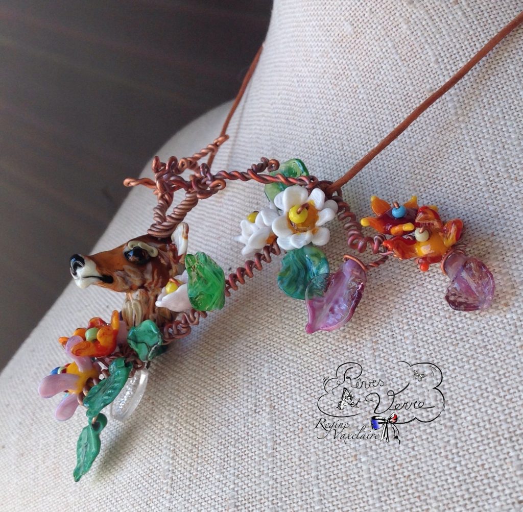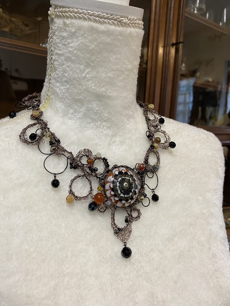 Je travaille à partir partir de mes perles en verre filé, de fil de cuivre travaillé en dentelle au fuseau, au crochet, d'électroformage etc ...