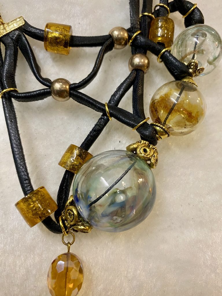 Mes création s'enrichissent également de valorisation et de réutilisation de matériaux nobles, tels le cuir, d'anciennes perles. Je travaille également le bronze, les émaux sur cuivre. Certains éléments sont achetés dans des boutiques Francaises le plus souvent.