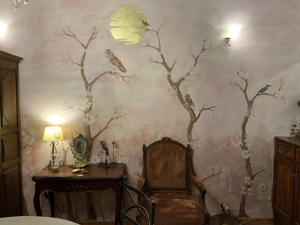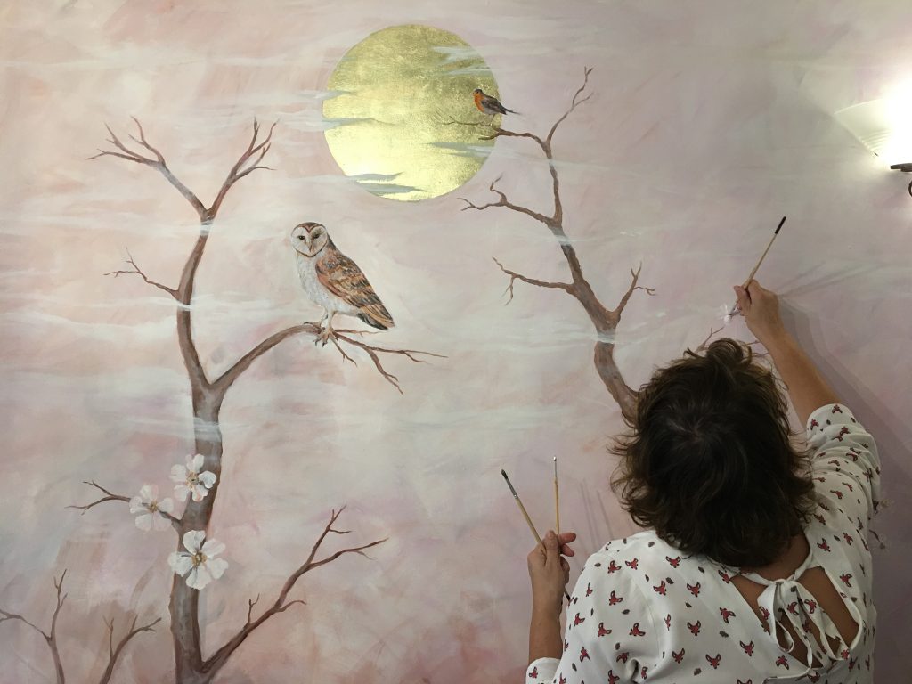 Mur peint à l'acrylique et ajouts de feuilles de cuivre.